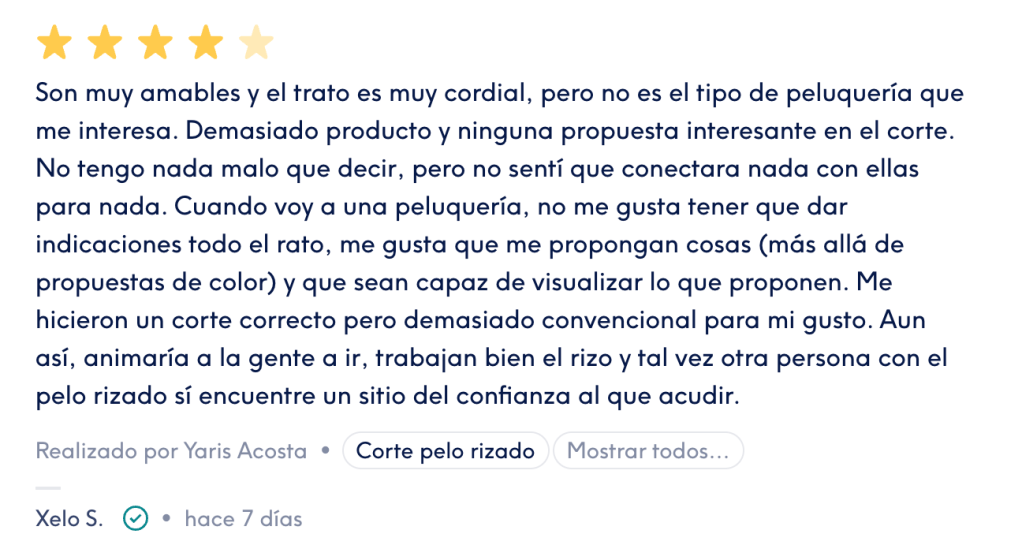 Cuando llegué a casa, ya me estaba esperando un mensaje para dejar una reseña a través de Treatwell. Siempre es un error responder en el momento. Hay gente que en caliente, está enfadada y dice cosas subidas de tono que en realidad no quiere decir. A mí me pasa al revés. Tiendo a evitar el conflicto y quise ser excesivamente correcta. Valga este post eterno para enmendar un comentario poco reflexionado y excesivamente bienintencionado.